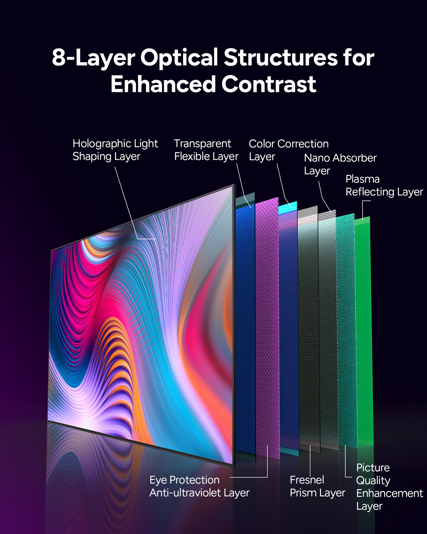 Experience enhanced contrast like never before with our advanced 8-layer optical technology. Crafted using chip-making techniques, our screens deliver unparalleled depth and clarity for a truly immersive viewing experience.